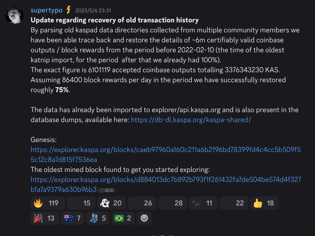 因此,我们正在努力拼凑完整的历史记录(所以,特别是,如果你恰好有旧的数据目录,请在我们的Discord服务器的 #datadir-exchange 频道中联系我们)。