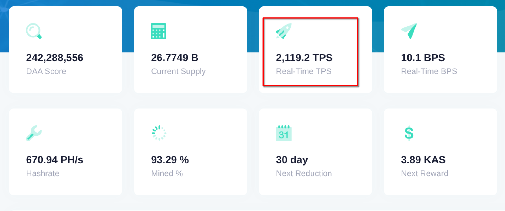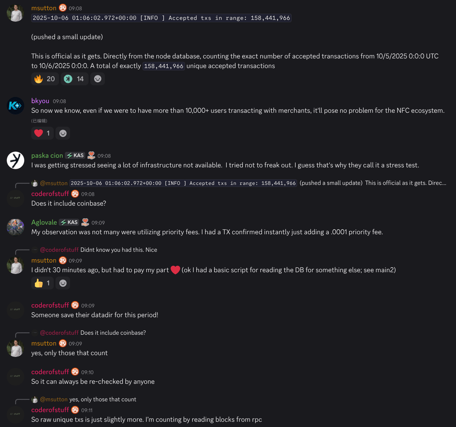 的 24 小时内,Kaspa 组织了一次主网压力测试。TPS 长时间维持在两千多,总共完成超过 1.58 亿笔交易。主网运行稳定,转账没有延迟。
